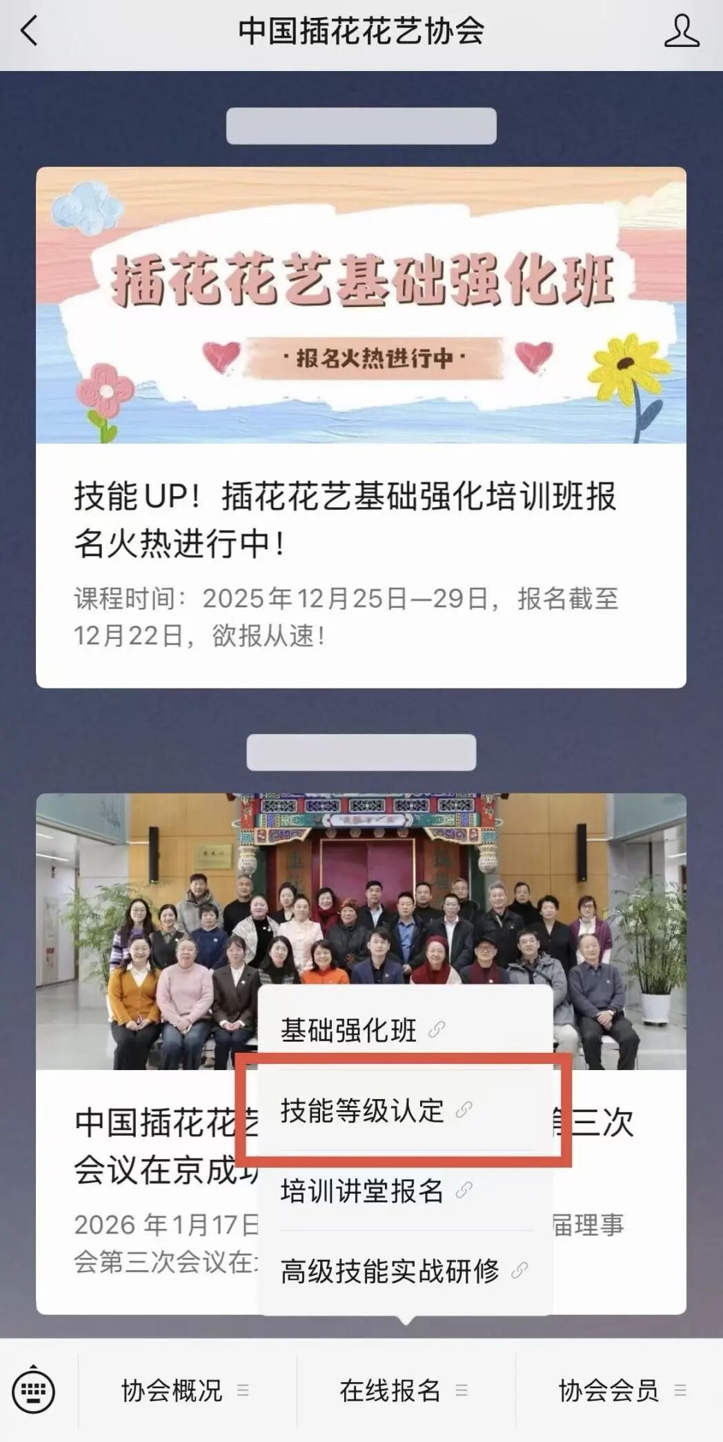 个人报名:进入“中国插花花艺协会”微信公众号主页,选择“在线报名”—“职业技能等级认定”,在线填写报名信息。