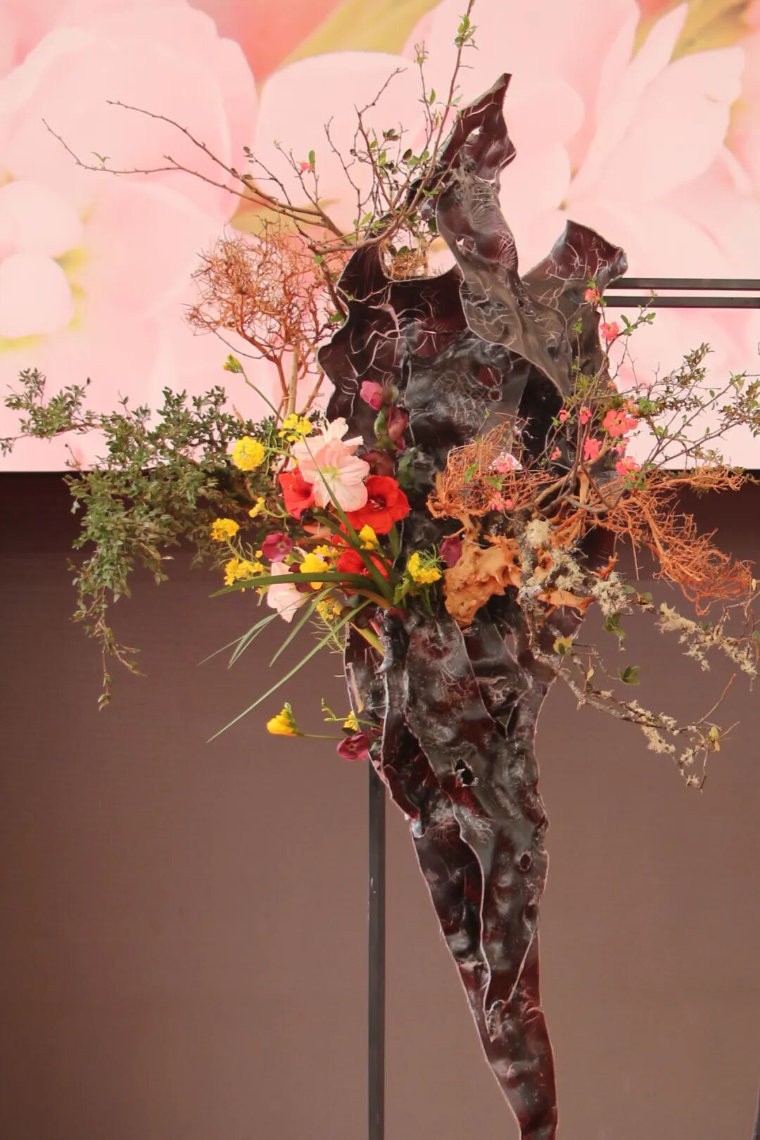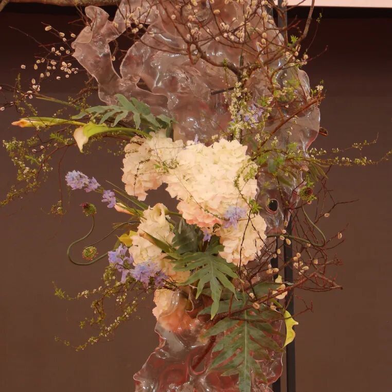 作品取名《春风化雨万物苏》,以大写意手法,用清透俊朗的亚克力太湖石为基底,搭配舒展花枝,将春风的轻柔与万物的复苏定格于方寸之间,展现中式花艺不拘一格的新生力量。