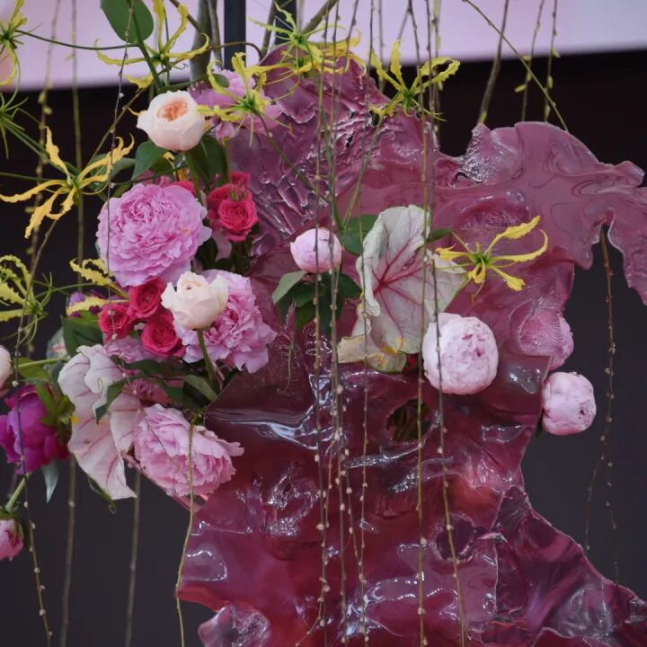 本次插花表演以“风、花、雪、月”为主题,四位花艺师选用质感通透的亚克力材质,复刻经典太湖石的灵秀风骨,搭配四时花卉,将传统东方意境与现代设计美学巧妙融合,呈现一组匠心独具的主题创作。